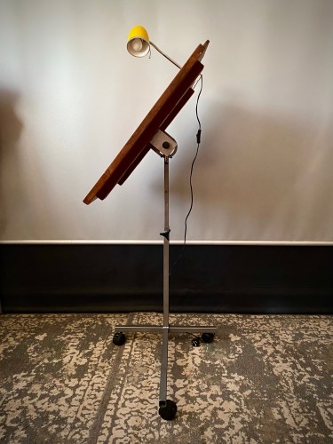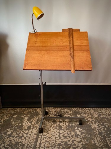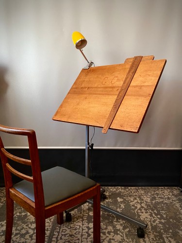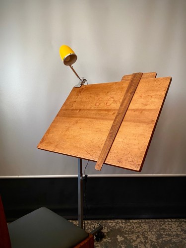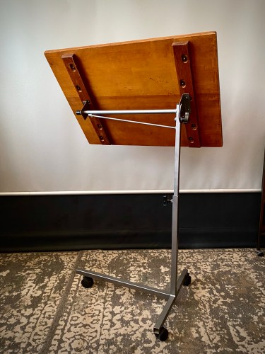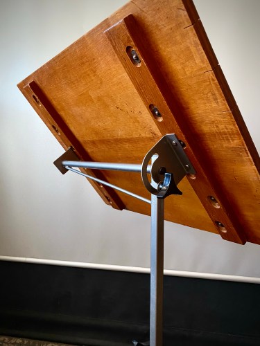 Pine top has been stripped back and refinished, although it does show signs of previous use in the drawing pin marks that have been used to secure drawing sheets over the years. T-shaped base is 58cm wide by 50cm deep and height is adjustable to about 145cm high, so can be used sitting or standing. Top is 76cm wide by 58cm high. $160