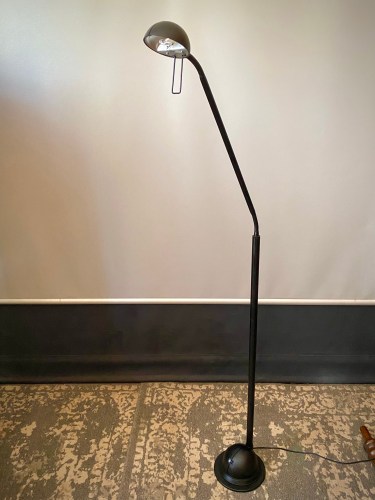 Classic 1980s minimalist black halogen floor lamp. Twin adjustable gooseneck fittings, a swivel head shade, and a two-step switch to change from higher to lower brightness. In excellent condition and rewired and tested to comply with current Australian electrical standards. $175