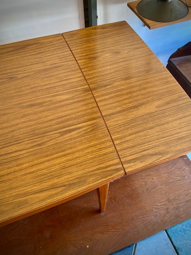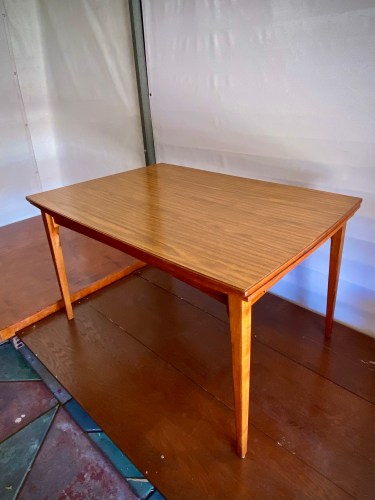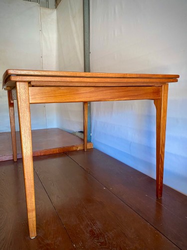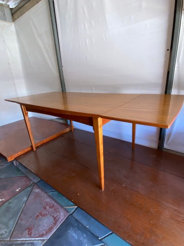 Made by famed furniture makers Noblett in South Australia in the 1960s. This dining table has solid teak base and trims, tapered legs and curved side supports, and can seat 6 people when closed. It features a lightly curved boat-shaped top with twin leaf extensions at each end that can expand to seat 8 or possibly even 10. It has been fully restored and re-oiled and the top is in good condition with no major scratches or chips. Measures 73cm high and 91cm deep at its middle point. The width is 132cm when set for 6 and 2.1m fully extended. $700