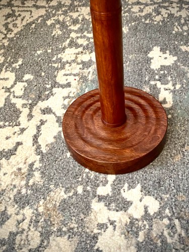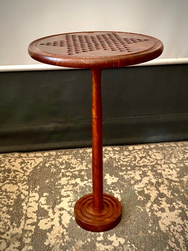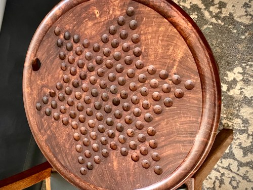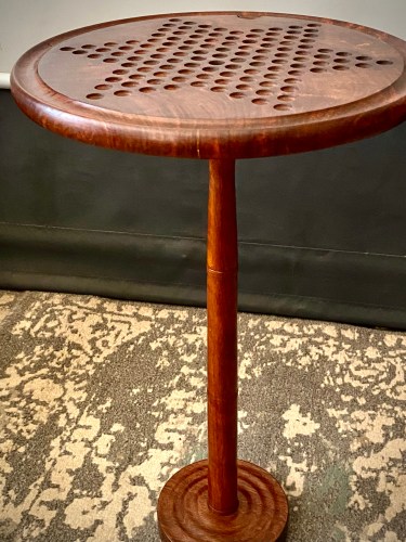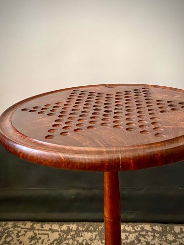 1970s Chinese Checkers table in mango wood and Queensland maple. Tapered and turned base and stem, stripped and oiled. A cute and versatile piece that can be used as a side table, a lamp table, or even just to play checkers. Measures 62cm high and the tabletop diameter is 37cm. $100